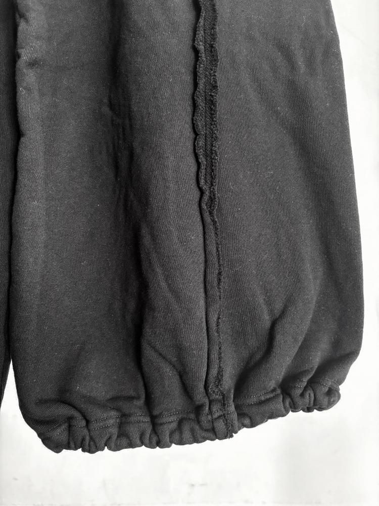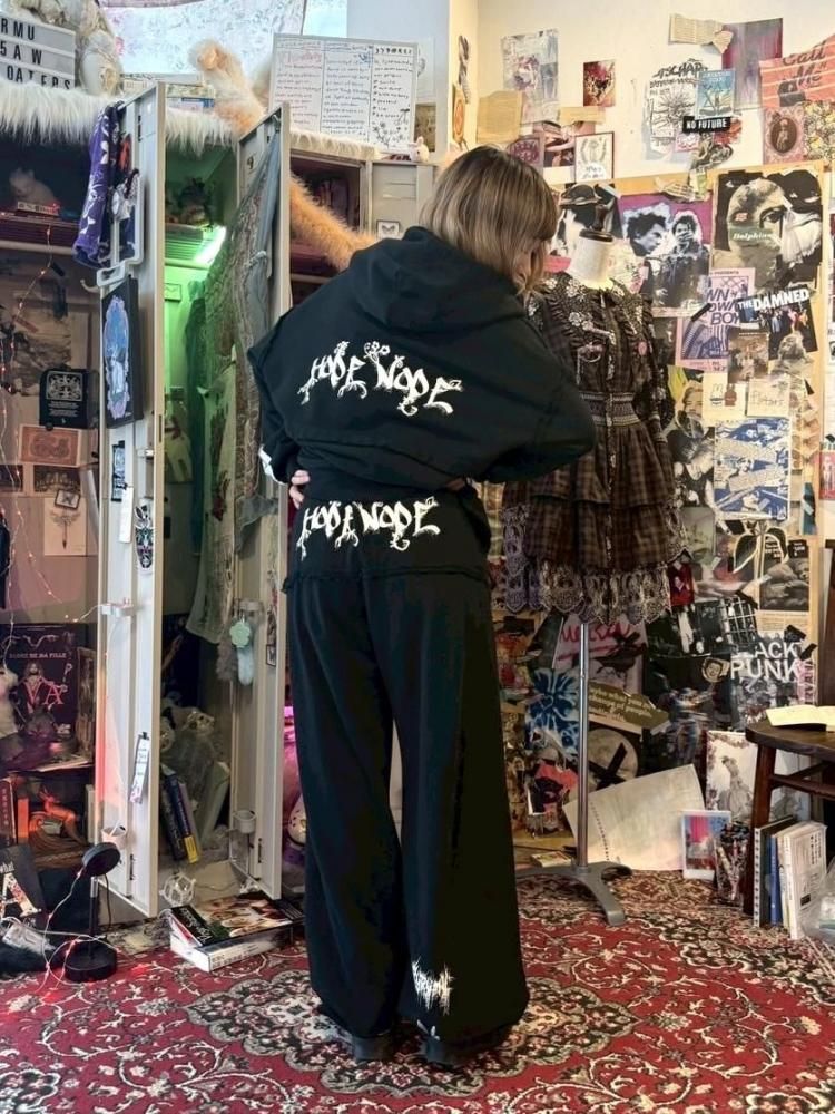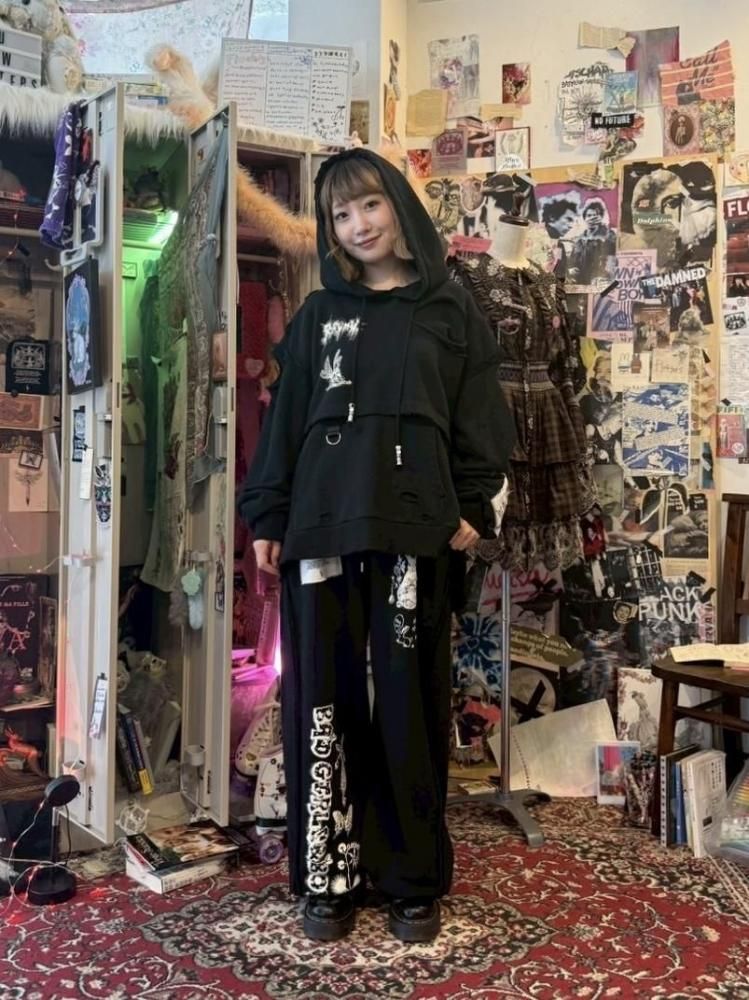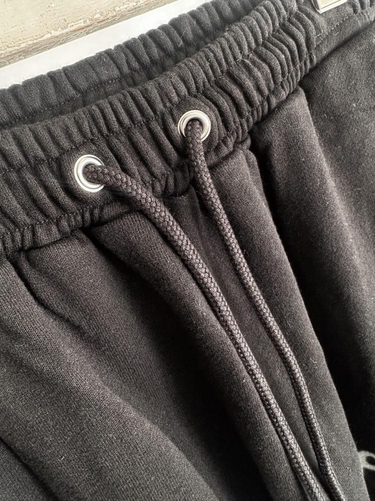 前後にグラフィックをプリントしたワイドスウェットパンツ。