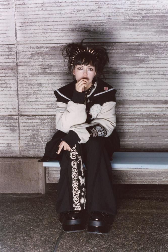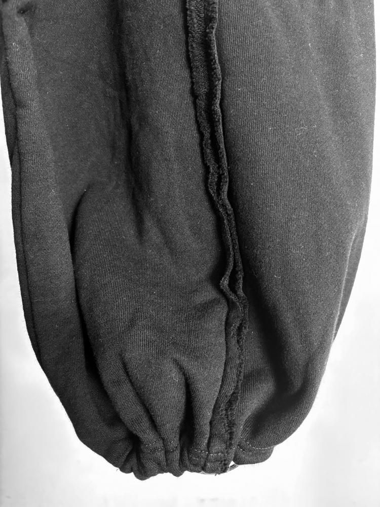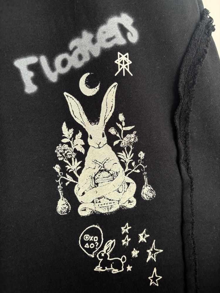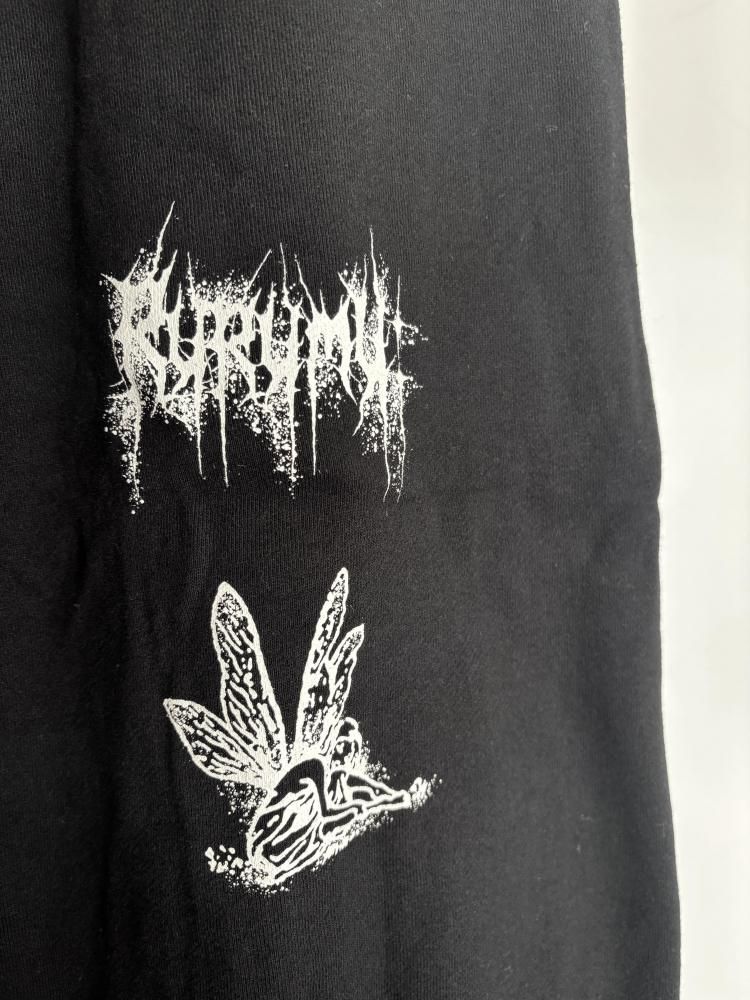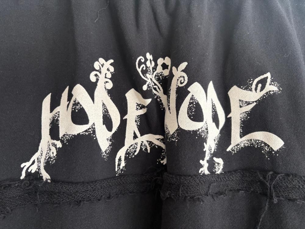 前後にグラフィックをプリントしたワイドスウェットパンツ。
