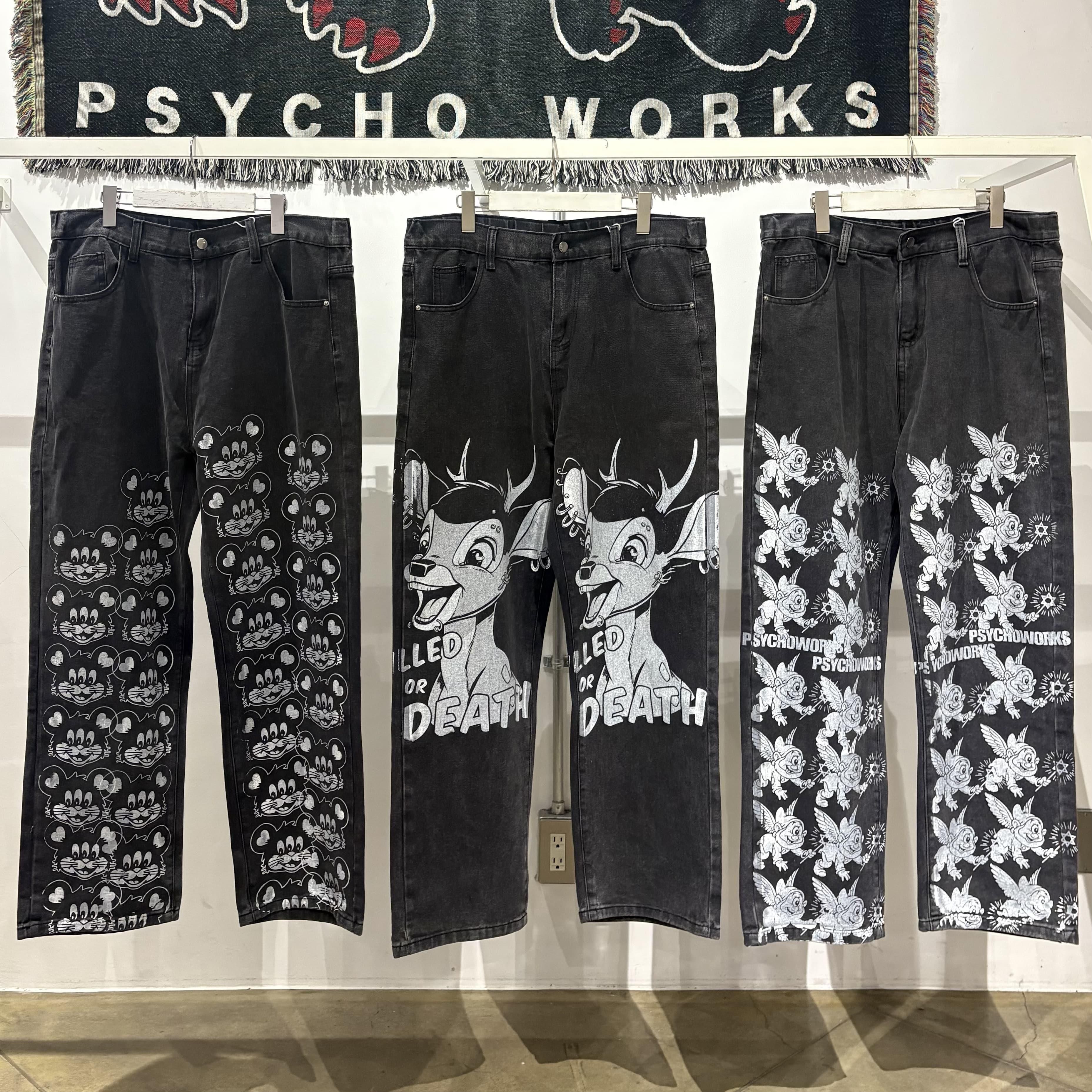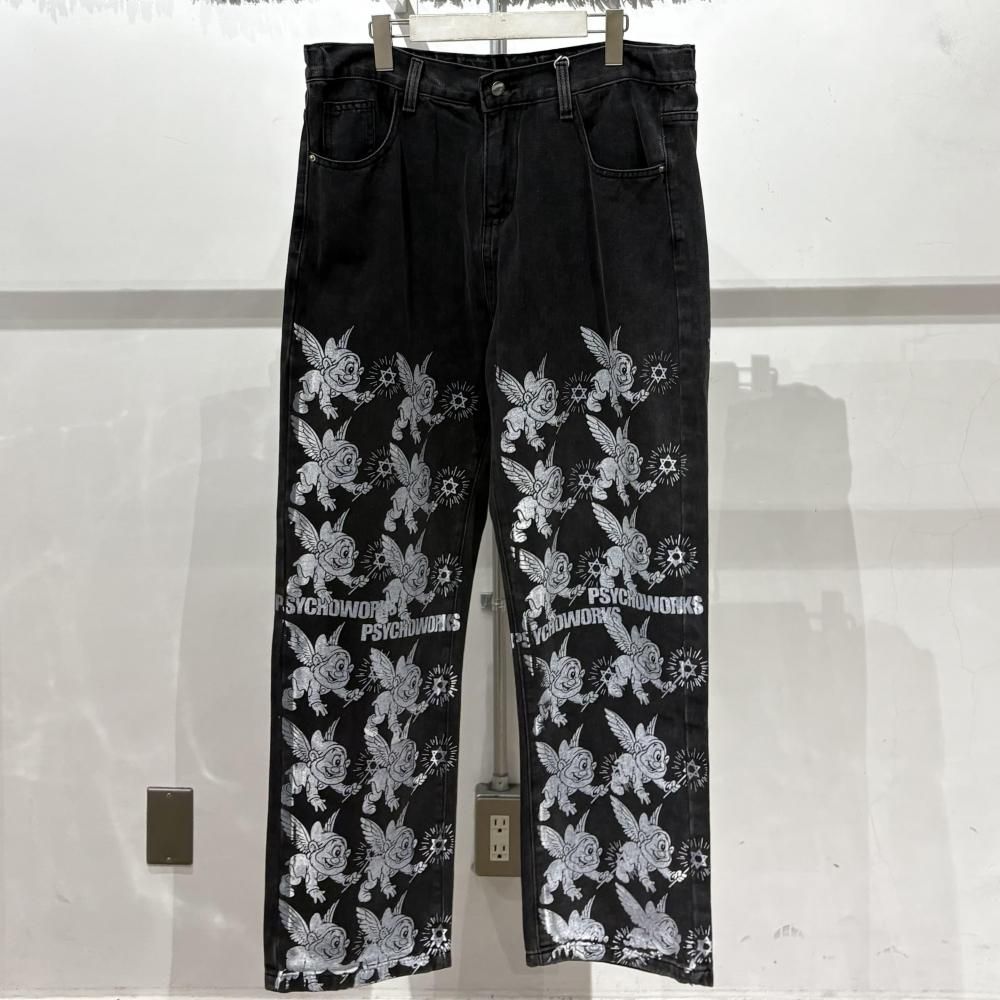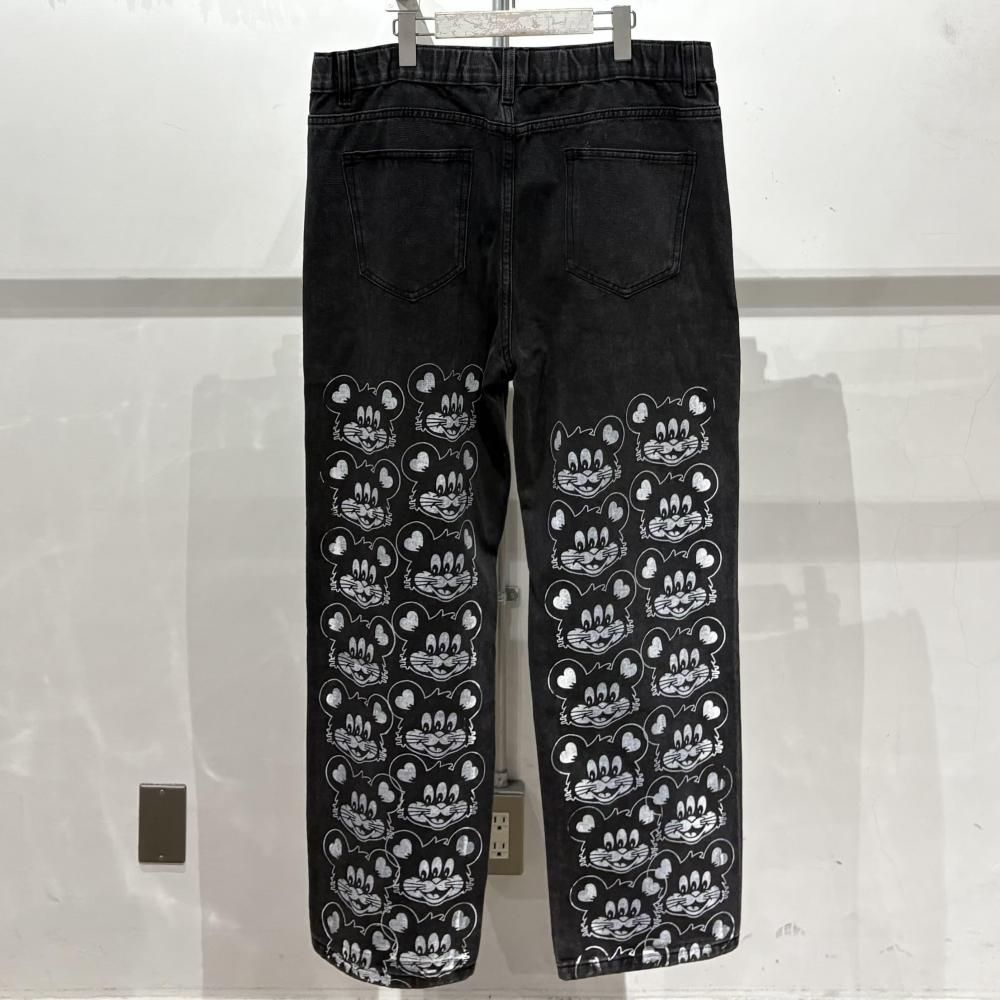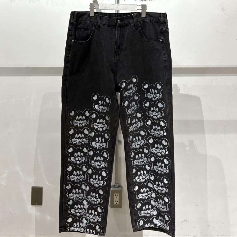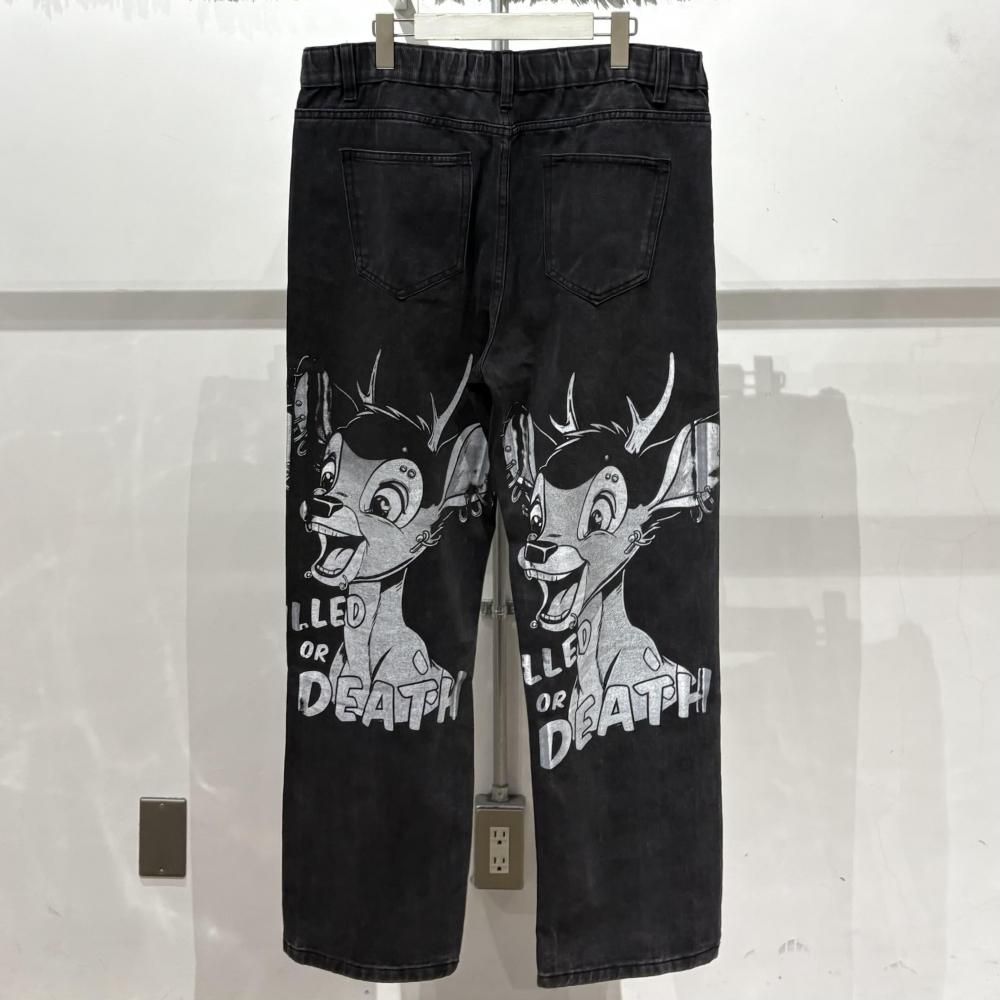 前後にオリジナルグラフィックをプリントしたビッグサイズのデニムパンツ。