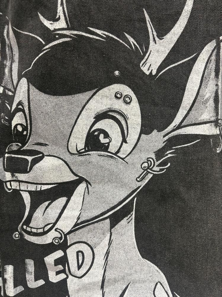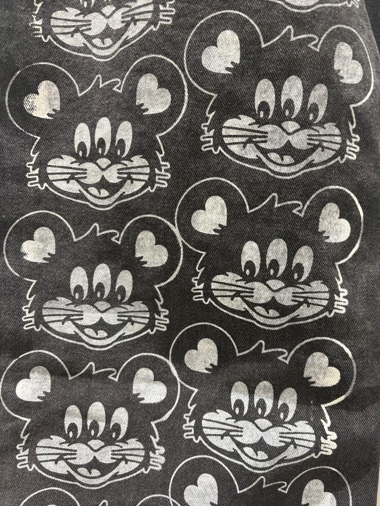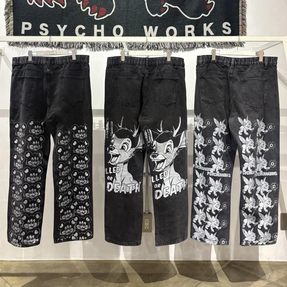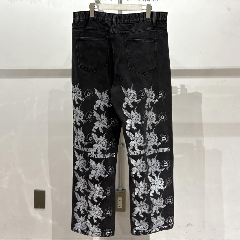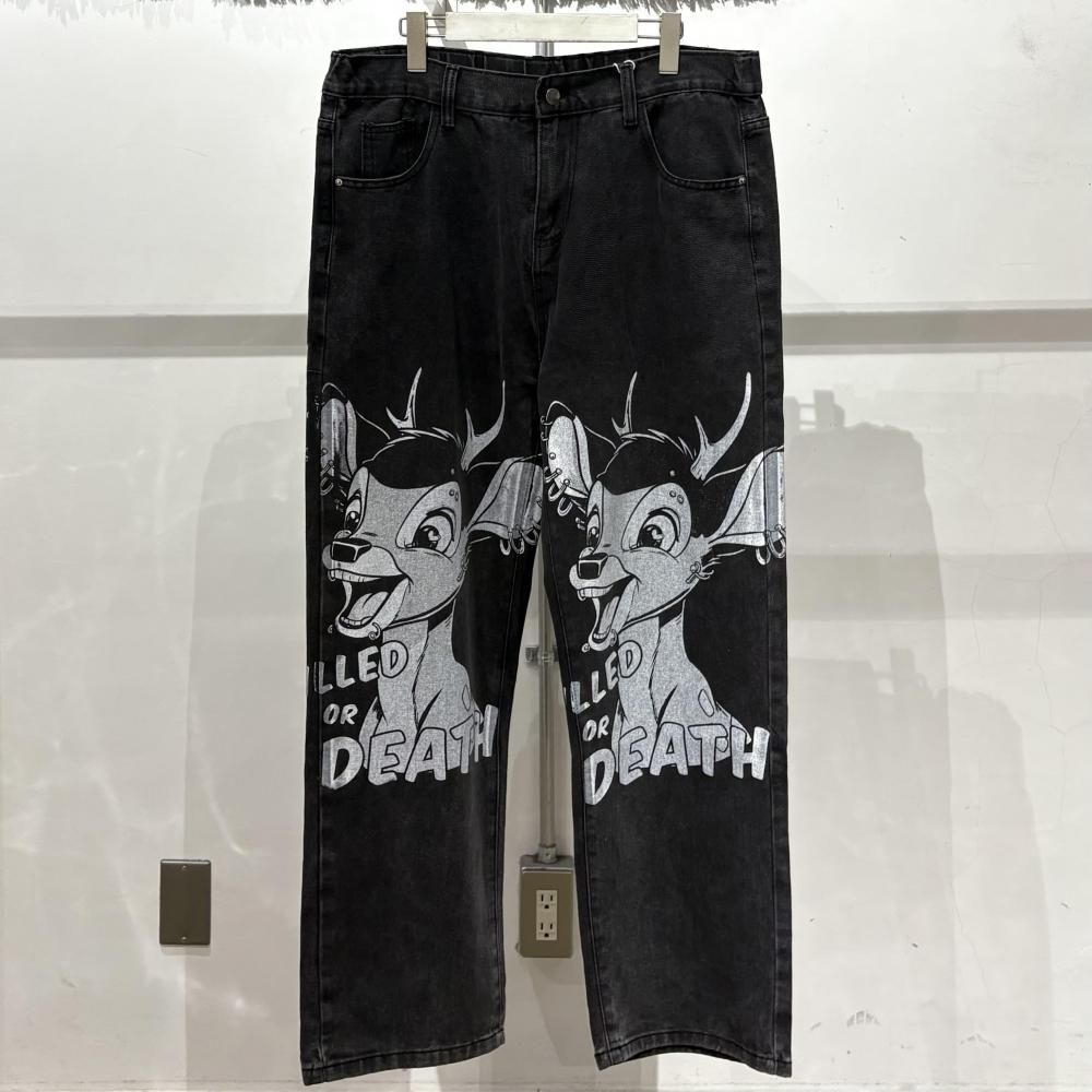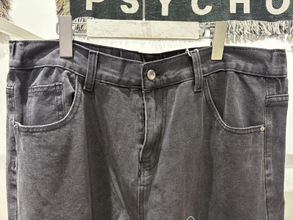 前後にオリジナルグラフィックをプリントしたビッグサイズのデニムパンツ。