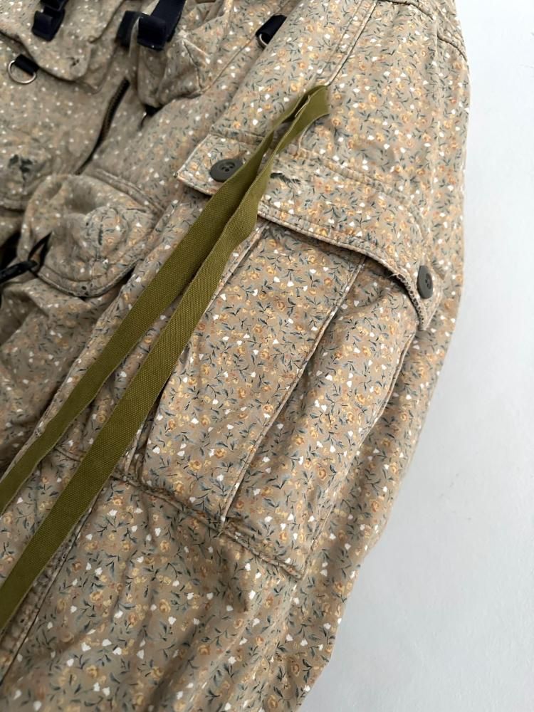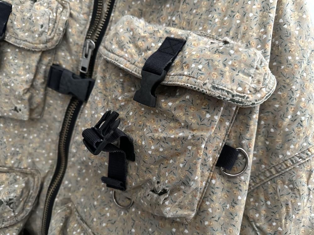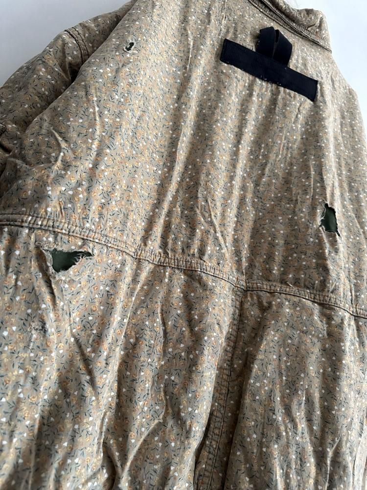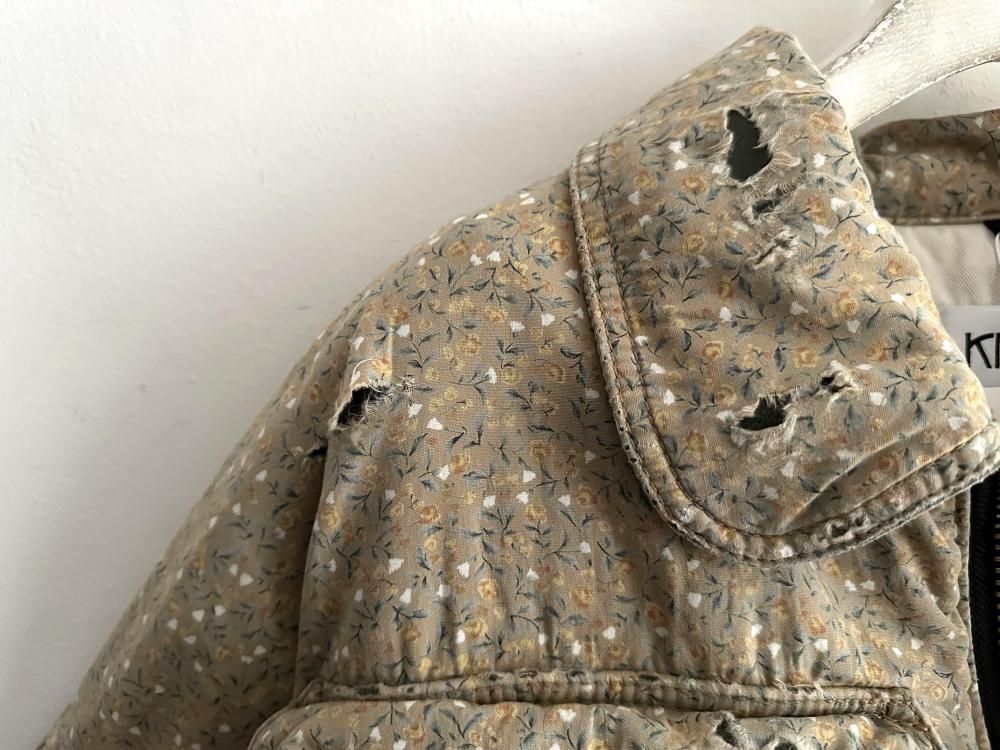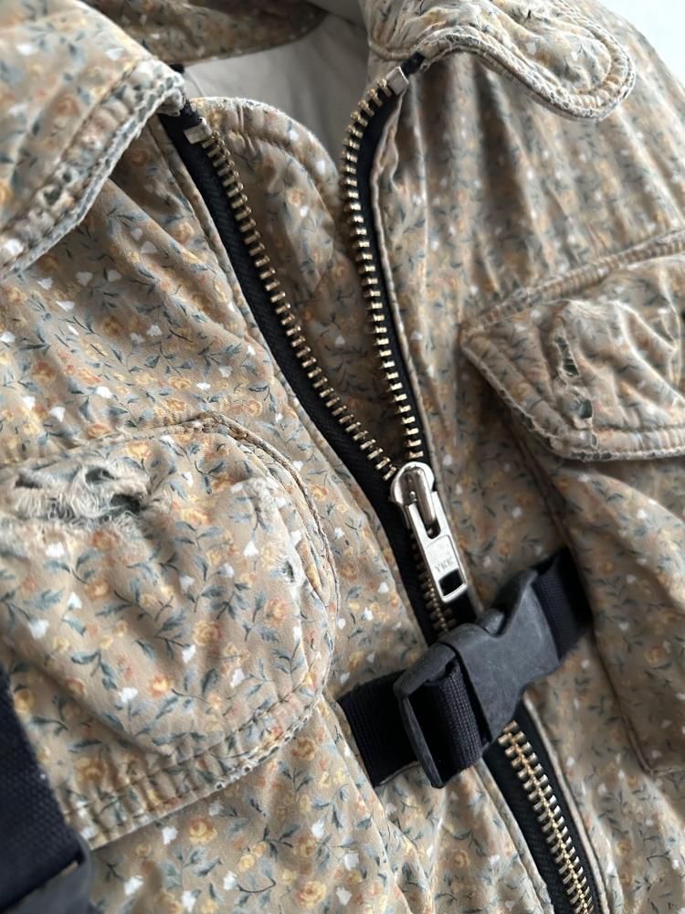 ガーリーな花柄生地に対し、全面にダメージ加工を施すことで退廃的でビンテージ感のる